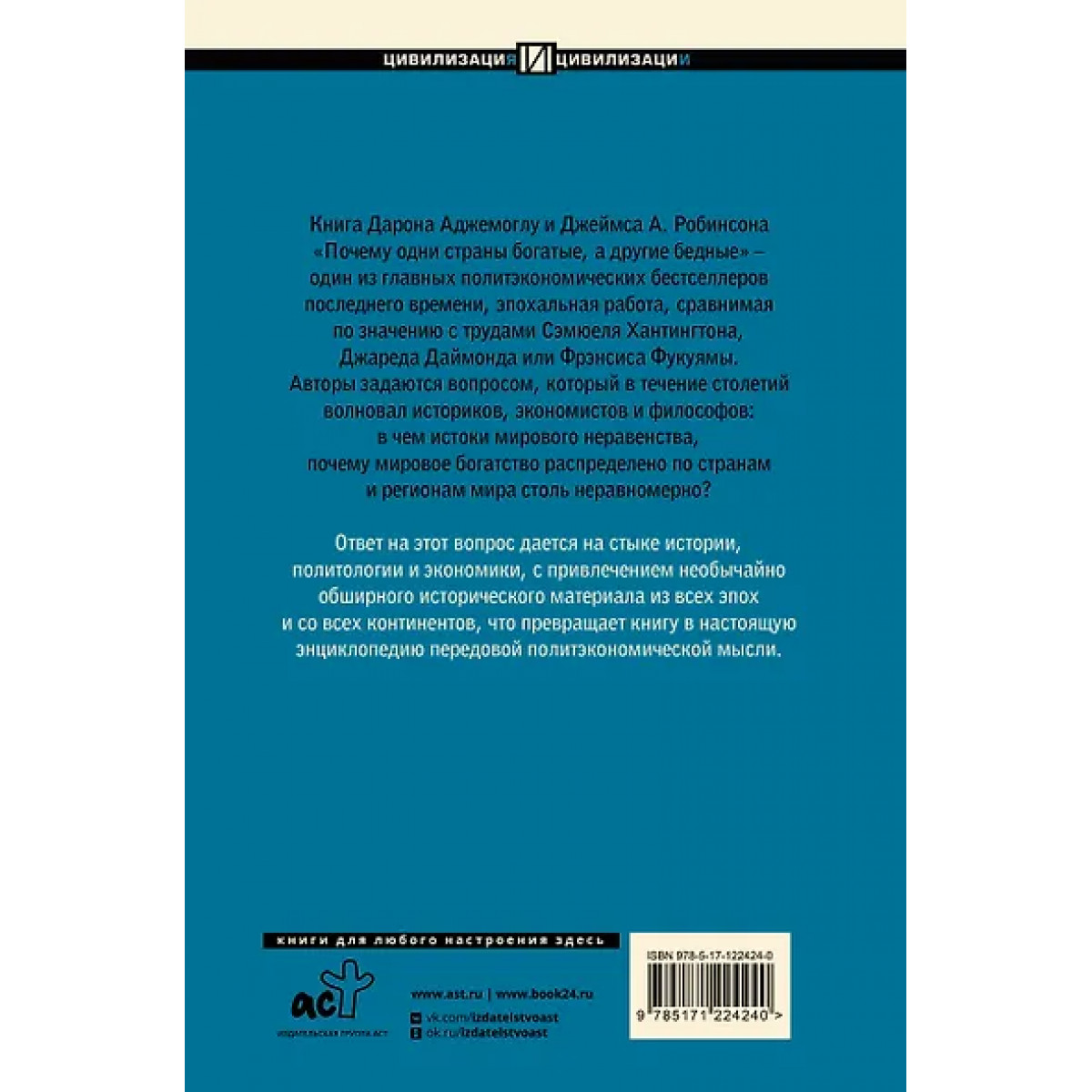 Книга Дарона Аджемоглу и Джеймса А. Робинсона «Почему одни страны богатые, а другие бедные» — один из главных политэкономических бестселлеров последнего времени, эпохальная работа, сравнимая по значению с трудами Сэмюеля Хантингтона, Джареда Даймонда или Фрэнсиса Фукуямы. Авторы задаются вопросом, который в течение столетий волновал историков, экономистов и философов: в чем истоки мирового неравенства, почему мировое богатство распределено по странам и регионам мира столь неравномерно? Ответ на этот вопрос дается на стыке истории, политологии и экономики, с привлечением необычайно обширного исторического материала из всех эпох и со всех континентов, что превращает книгу в настоящую энциклопедию передовой политэкономической мысли.