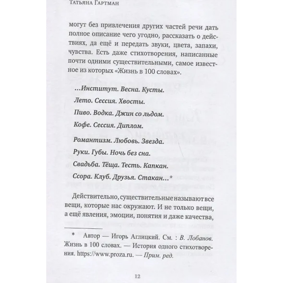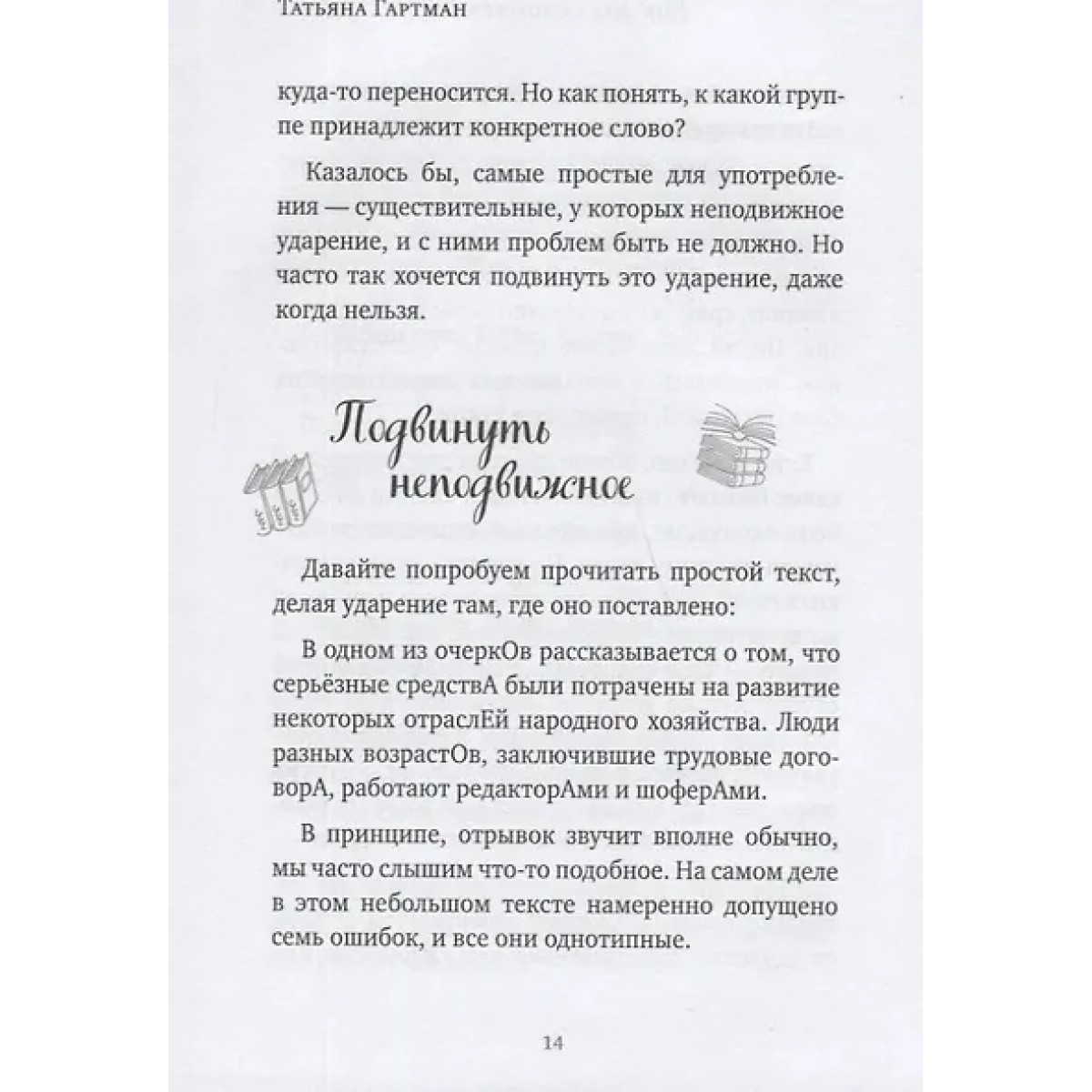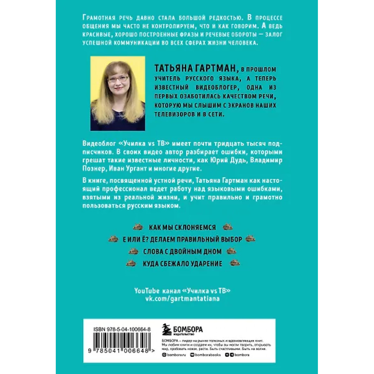 Грамотная речь давно стала большой редкостью. Кроме книги найти правильный русский язык просто негде. В процессе общения люди часто не утруждают себя правильным произношением. В своей книге, посвященной устной речи, Татьяна Гартман, известный видеоблогер (Училка vs ТВ), ведет работу над ошибками речи, взятыми из реальной жизни, и учит правильно и грамотно пользоваться русским языком.